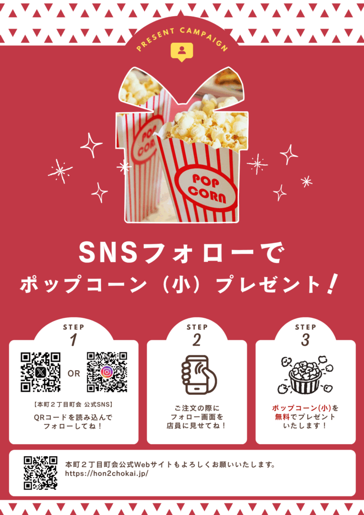 また、最近本町2丁目のSNS運用を始めたこともあり、これからどんどんフォローしていただきたいということも踏まえ、今回SNSフォローでポップコーン(小)をプレゼントさせていただきます。