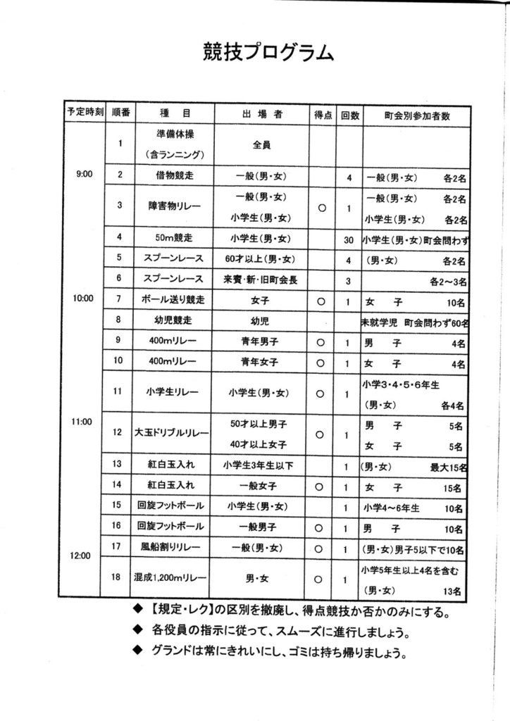 小学生参加の種目や、年齢別の種目などありますので、皆さんお声合わせの上ご参加いただけると嬉しいです。